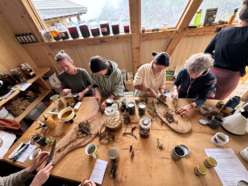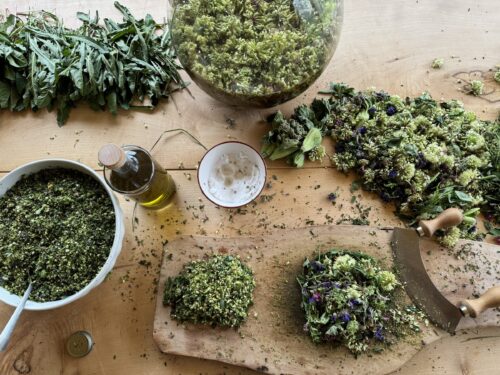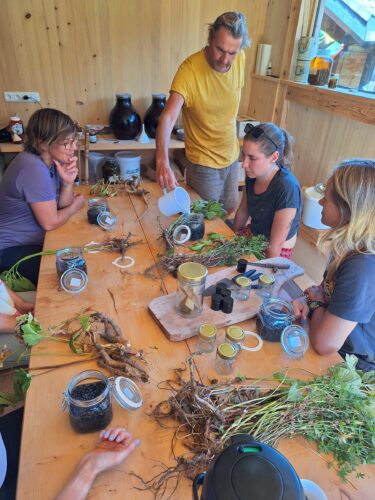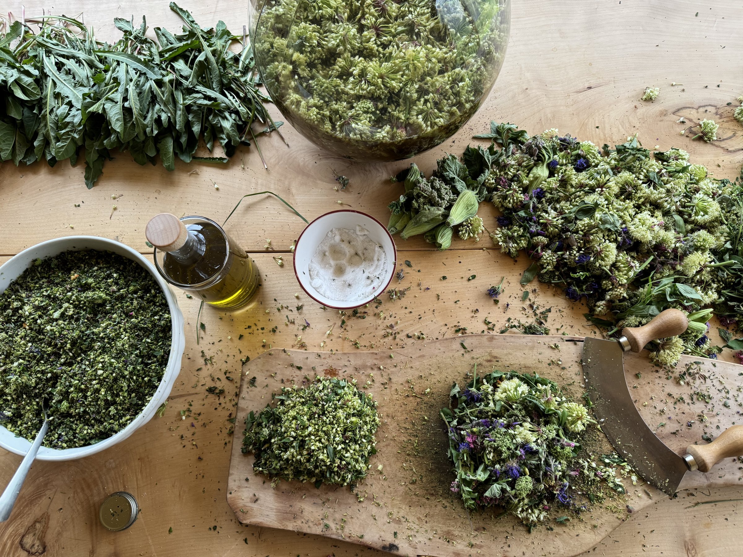 Wir sammeln die Pflanzen achtsam in ihrem natürlichen Umfeld, lernen ihre Wirkweisen kennen und verarbeiten sie für die Küche sowie zu eigenen Pflanzenprodukten wie Tinkturen und Oxymele.